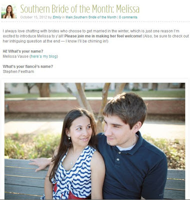 Oh my stars!!! It has been an unspoken goal of mine ever since I became an avid reader of Southern Weddings Magazine's blog, to be a Southern Bride of the Month. Each month, SW mag features an engaged "southern belle" and interviews on her trial, tribulations, joys, and fun tid-bits about being engaged and how the wedding planning process is coming along.